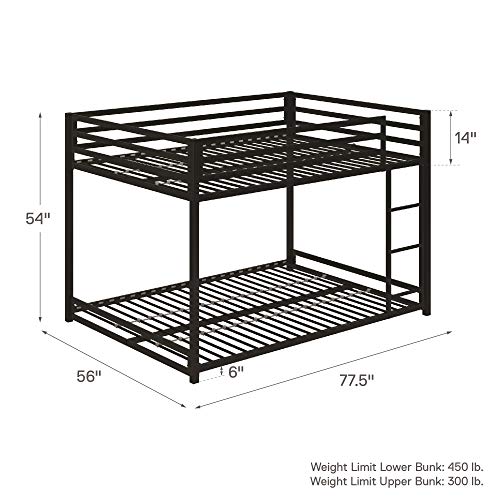 - Product dimensions – 77.5" L x 56.5” W x 54” H | Clearance left between beds – 49.84” | Mattress max height – 6” | Weight limit (Upper/ Lower bed) – 300/300 lbs. | Distance between slats – 3.5”